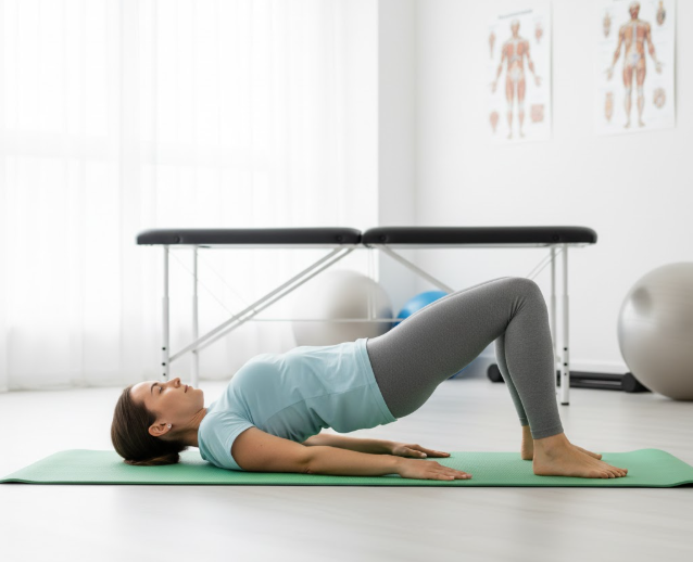 The bridge exercise strengthens your glutes, hamstrings, and lower back — muscles that support your spine and pelvis.